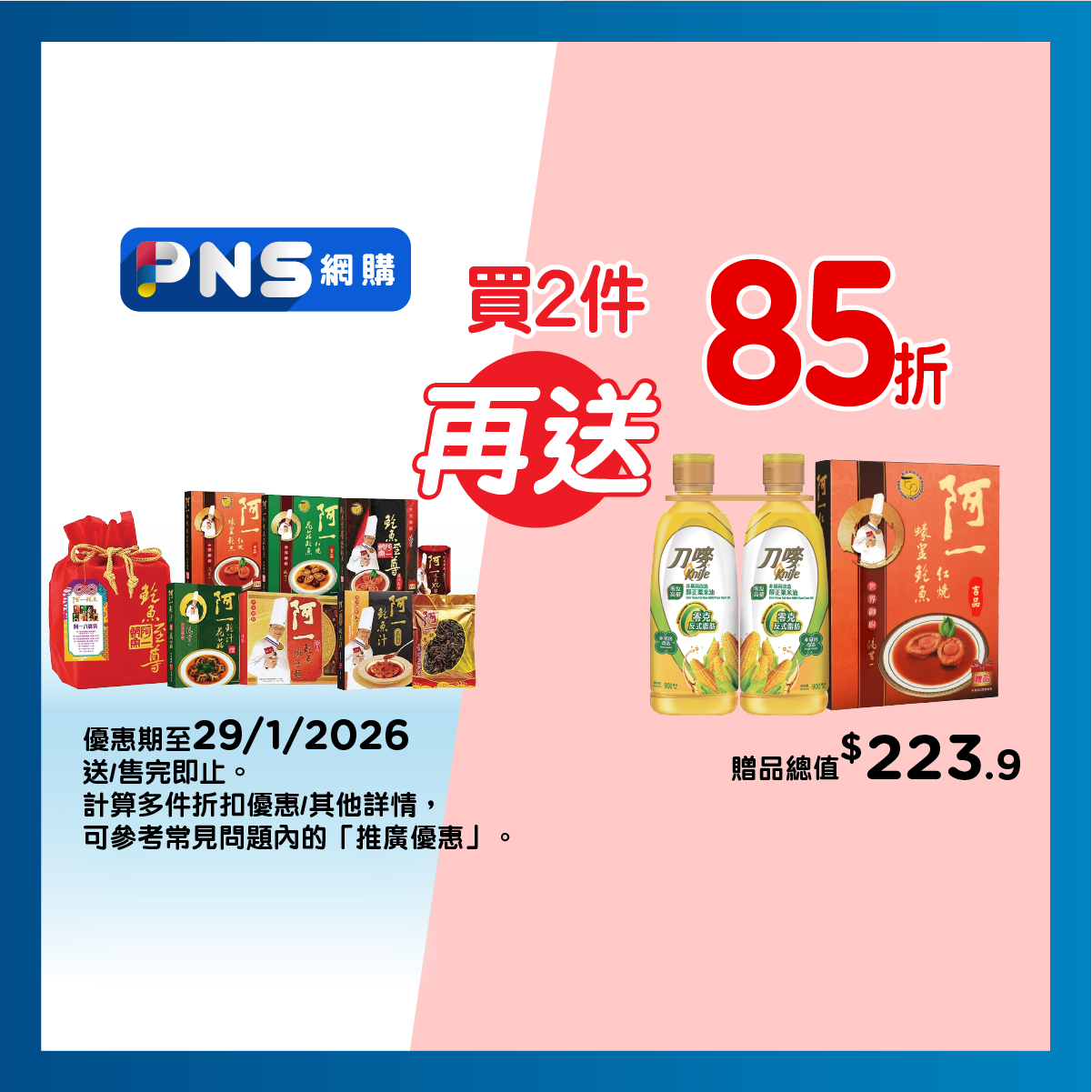 Purchase any canned abalone / abalone fortune bag/ abalone gift boxes over $388, can get a pc of KNIFE ZERO TRANS FAT NON-GMO PURE CORN OIL 900MLX2 for free. Offer is only applicable to each single transaction. While stock lasts.Exclude Freebie/redemption items