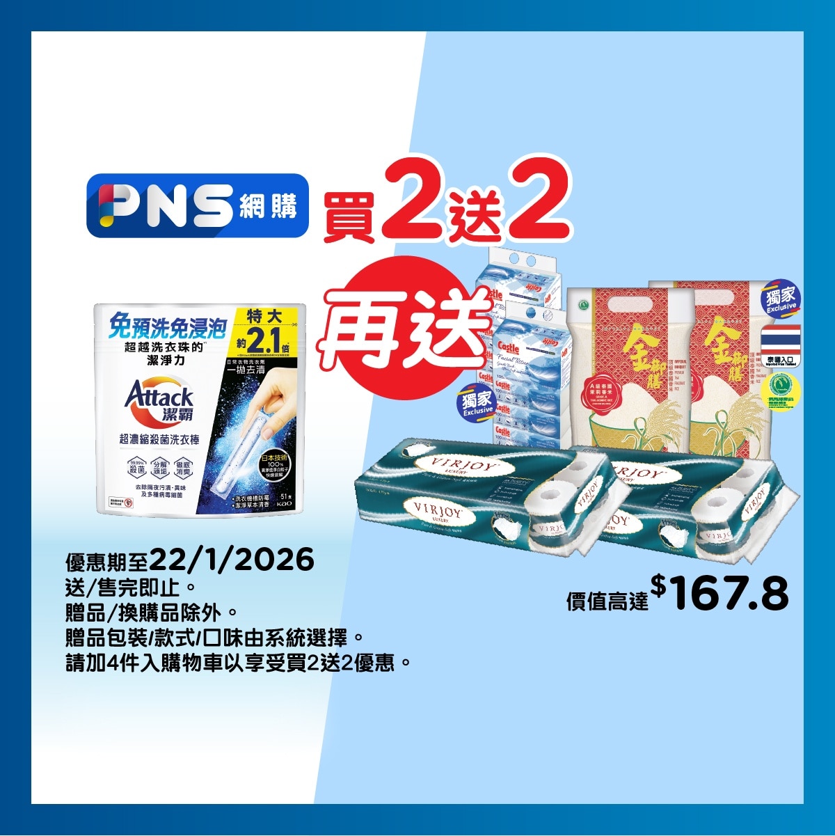 全線潔霸洗衣棒46/51S買4件,送金御膳A級泰國茉莉香米1KG x2件。數量有限,送完即止,優惠以每張發票計算。(贈品/換購品除外)<BR> 詳情
