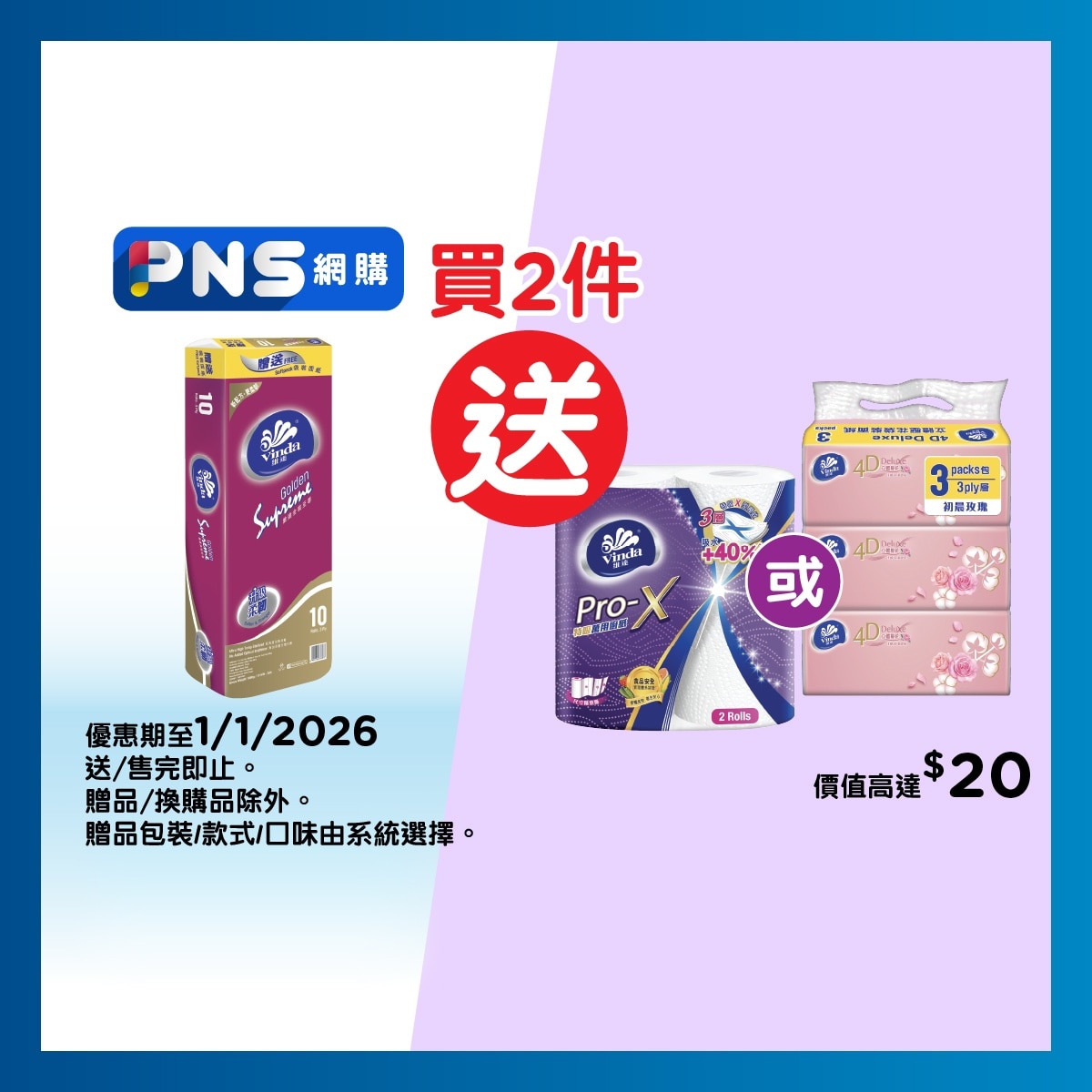 全線維達金裝至尊三層衛生紙買2件,送維達萬用廚紙/袋裝面紙(隨機一款)。數量有限,送完即止,優惠以每張發票計算。(贈品/換購品除外)<BR> 詳情